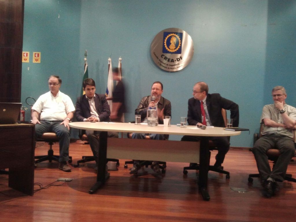 A mesa foi composta pelo mediador, o chefe do departamento técnico do Crea-DF, Wilson Dias, pelo conselheiro do Crea-DF, Eng. Mecânico Francisco Rabelo, pelo diretor comercial da Caesb, Geraldo Julião Junior, pelo superintendente de comercialização da Caesb, Ricardo Zorzo e pelo presidente da Assosíndicos, Paulo Roberto Melo.