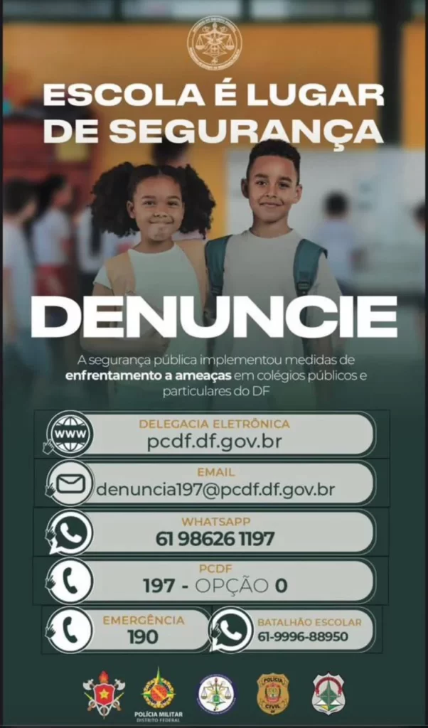 Depois da reunião em nível federal na Presidência da República, a Câmara Legislativa abriu o debate sobre a segurança nas escolas. Diversas famílias decidiram não mandar as crianças para os colégios amanhã, devido aos rumores de possíveis atentados. O VP entrou em contato com escolas que tinham provas marcadas para o dia 20, mas suspenderam as avaliações a pedido dos pais que não querem que os filhos saiam de casa. Na sessão que durou a tarde toda na CLDF, o tema foi a ação da Secretaria de Segurança a respeito das ameaças. O secretário, Sandro Avelar, disse que foram feitas 16 apreensões de material considerado violento e reforçou que as pessoas precisam voltar à normalidade. Abaixo, seguem os canais de denúncias abertos no DF.