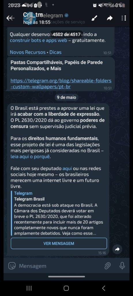 A terça-feira trouxe uma surpresa para os usuários do Telegram no Brasil. A exemplo do que fez o Google no dia esperado para votação do famoso e polêmico PL das ‘fake news’, o Telegram disparou para todos os usuários um recado contundente sobre a discussão.