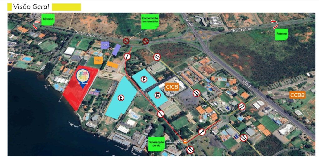 Para isso, os agentes de trânsito vão montar dois pontos de controle de tráfego e implantar sinalização nas vias adjacentes para direcionar o tráfego, colocando em sentido único a via principal do SCES Trecho 2, a partir do primeiro acesso, na altura da Agepol, em direção ao Clube dos Bombeiros. A rotatória do SCES Trecho 2, que dá acesso ao Na Praia, será fechada com barreiras de concreto.