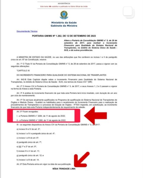Em uma publicação feita em seu Instagram, Dr. Francisco Cardoso disse que a revogação das Portarias n° 3264/22 e n° 3265/22 removeu regras essenciais do Programa de Qualidade de Doação de Órgãos. “Essas portarias eram fundamentais para garantir a segurança e a qualidade aos transplantes no Brasil, estabelecendo diretrizes rigorosas de testagem sorológica de doadores e permitindo o monitoramento de falhas críticas no sistema”, disse Dr. Francisco.